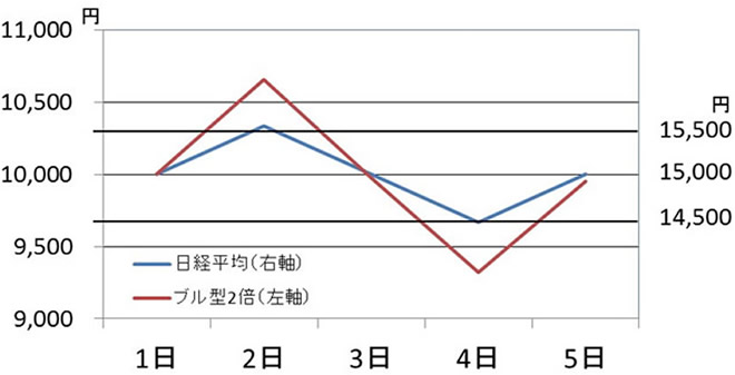 下の例を見てください。日々の値動きでみると、どの日を見てもファンドの値上がり・値下がり率はぴったり日経平均の2倍で、ファンドの目標通りになっています。しかし、5日間で見ると、5日目の日経平均が1日目の15,000円に戻ったとしても、ファンドの基準価額は1日目の10,000円には戻っていません。